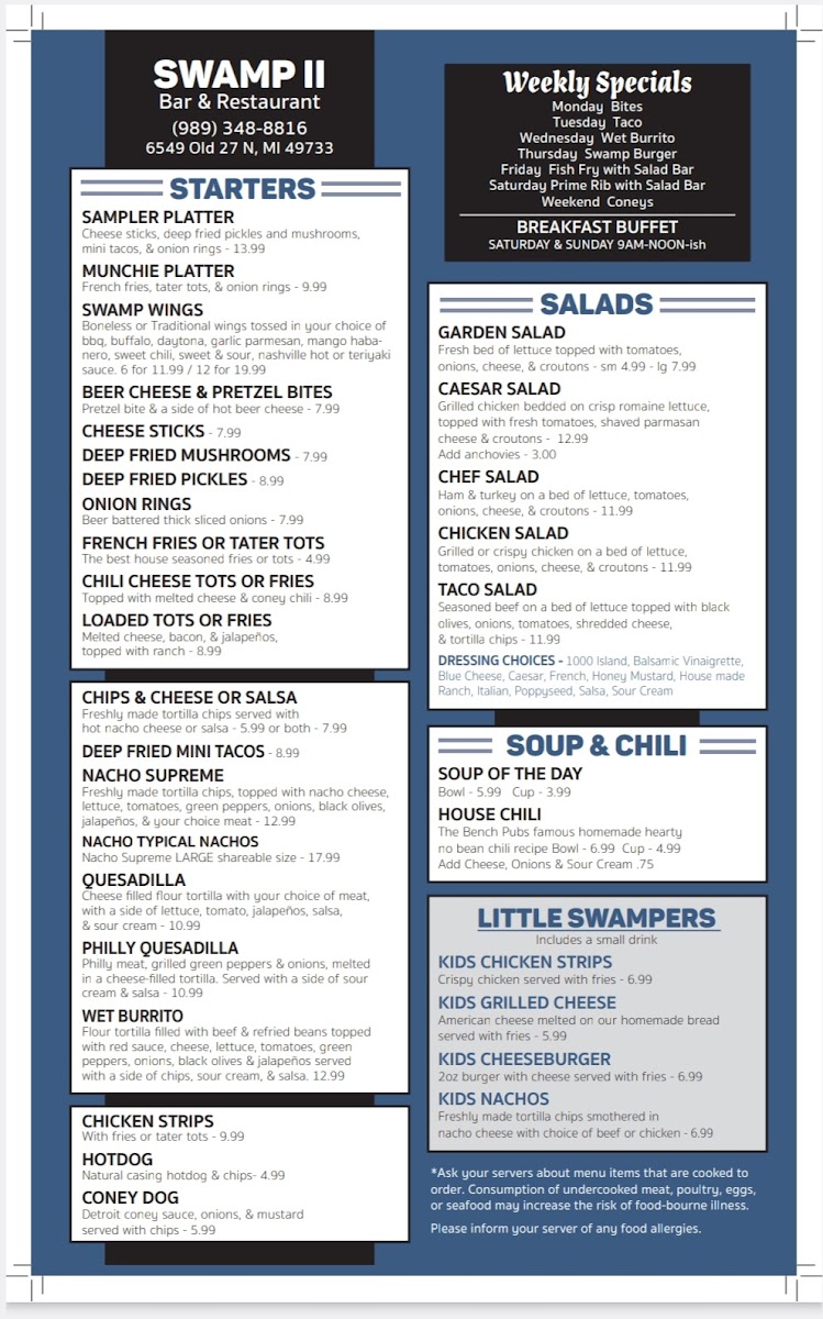 Welcome to Swamp II Bar & Restaurant, a hidden gem nestled in Frederic, MI. This cozy spot is perfect for those craving a relaxed atmosphere and hearty meals after exploring nearby Hartwick Pines State Park. The menu is a delightful mix of starters, salads, soups, and specialty burgers, with highlights like the Sampler Platter ($13.99) and the highly praised Swamp Burger. Customers rave about generous portions that leave you feeling satisfied without breaking the bank.
